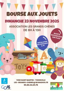 Le dimanche 23 novembre 2024 de 8h00 à 13h00, l’association organise une bourse aux jouets dans les locaux 1 rue Saint Martin 57100 Thionville.