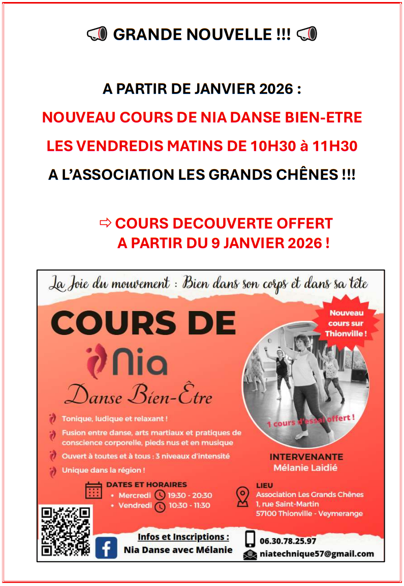 La technique Nia a été créée il y a 40 ans aux Etats-Unis, où elle est très répandue. Diplômée et certifiée par Nia International, Mélanie a hâte de vous faire découvrir cette discipline à la fois tonique, ludique et relaxante qui se pratique pieds nus et en musique. Elle est accessible à toutes et à tous, même si on n’a jamais dansé. Ce cours est proposé pour la première fois en région Grand-Est à l’Association « Les Grands Chênes ».